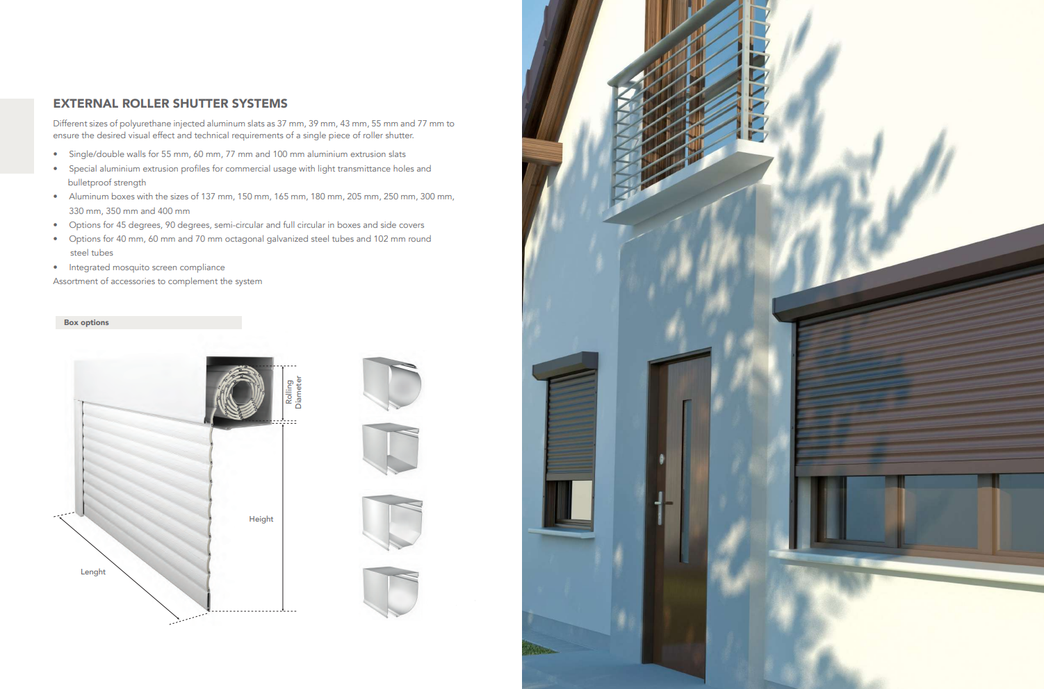 Different sizes of polyurethane injected aluminum slats as 37 mm, 39 mm, 43 mm, 55 mm and 77 mm to ensure the desired visual effect and technical requirements of a single piece of roller shutter.